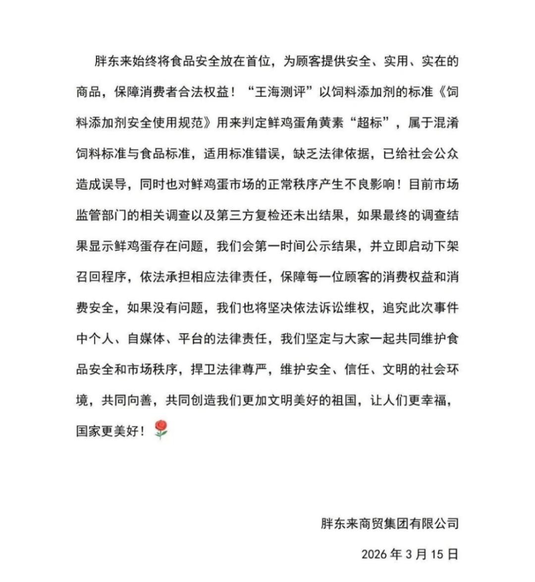 其态度十分明确:若检测结果证实鸡蛋确实存在问题,将立即下架、召回相关产品,并对消费者进行赔偿;若检测结果显示无任何问题,将起诉王海团队及发布相关视频的平台,依法维护自身合法权益。