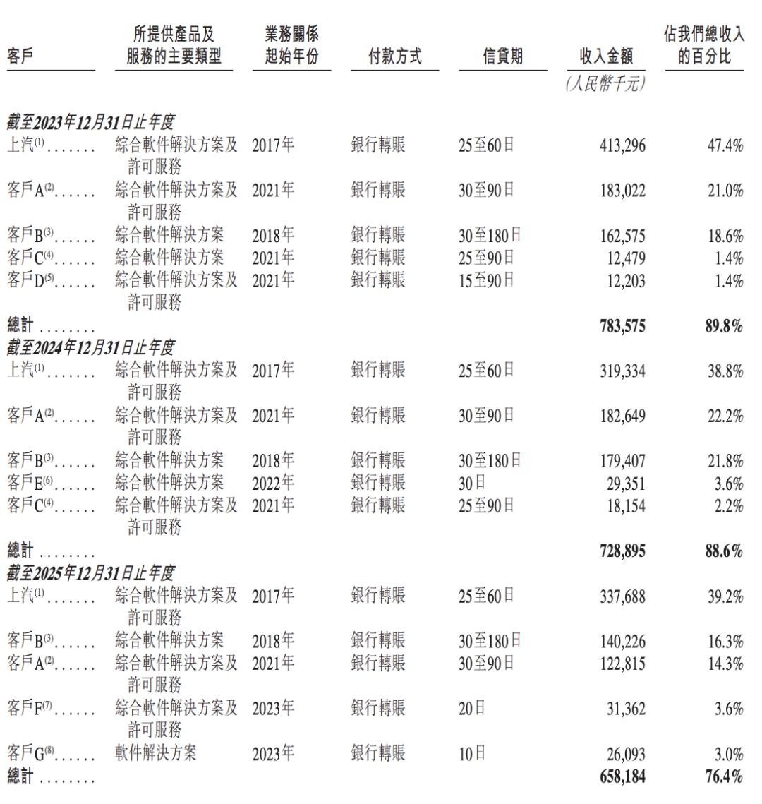 招股书显示,上汽一直是斑马智行的第一大客户。2023年至2025年,来自上汽的收入占比分别为47.4%、38.8%和39.2%。具体金额上,最近三年来自上汽的收入分别为4.13亿元、3.19亿元、3.38亿元。
