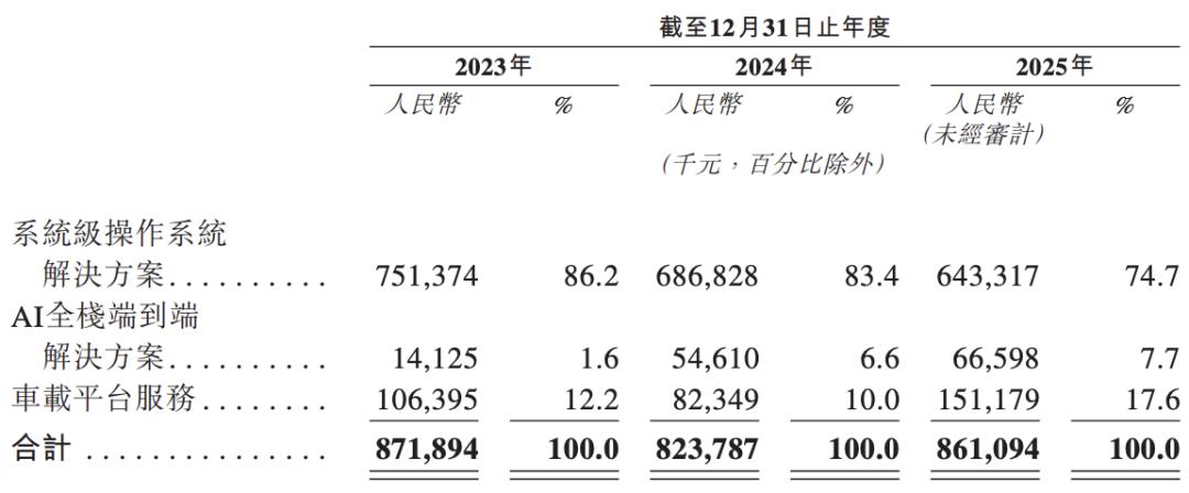其中,系统级操作系统解决方案是公司的压舱石。基于自研AliOS打造,2025年贡献收入6.43亿元,占总营收的74.7%。这是斑马智行的立身之本,也是投入最久、积累最深的技术底盘。但隐忧在于,这块业务收入从2024年至2025年有所下滑。