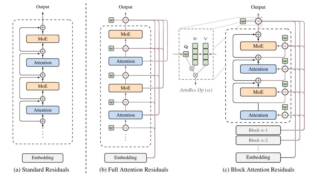 这套内容感知、输入依赖的选择机制,本质上是将Transformer的核心理念横向迁移至残差路径的设计中。残差连接由此从被动的“信息搬运”,转变为主动的“按需检索”,有效规避了深层信息稀释的痼疾。