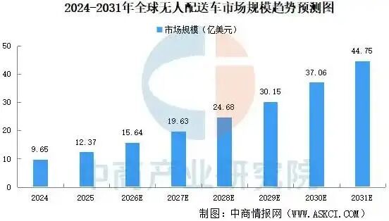 中商产业研究院发布的《2026-2031年全球无人配送市场深度研究及发展前景投资预测分析报告》显示,2024年全球无人配送车市场规模达到了9.65亿美元,2025年市场规模超12亿美元,预计2031年市场规模将达到44.75亿美元。