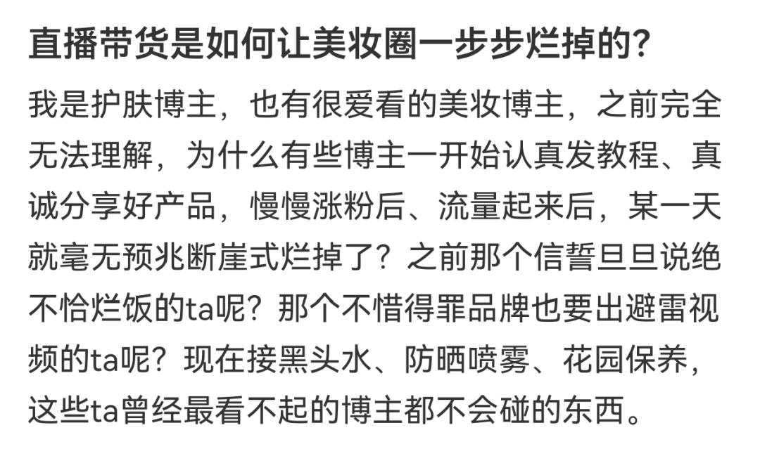 在很多博主看来,直播带货对粉丝粘性是一种消耗。大约在2021年,一批没怎么听过的品牌在直播间迅速崛起,一批美妆博主转型做起直播带货。许多尝试直播带货的美妆博主,最终都失败了,原因大多是“选品翻车”和“转化有限”。
