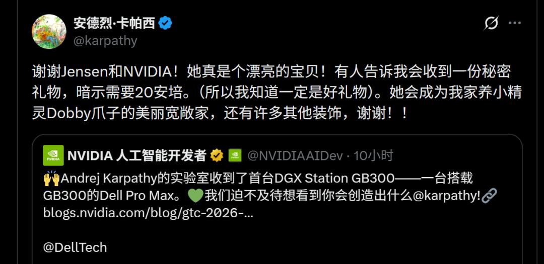 首台DGX Station(GB300)送给了卡帕西——这位AI时代的个人开发者代表。