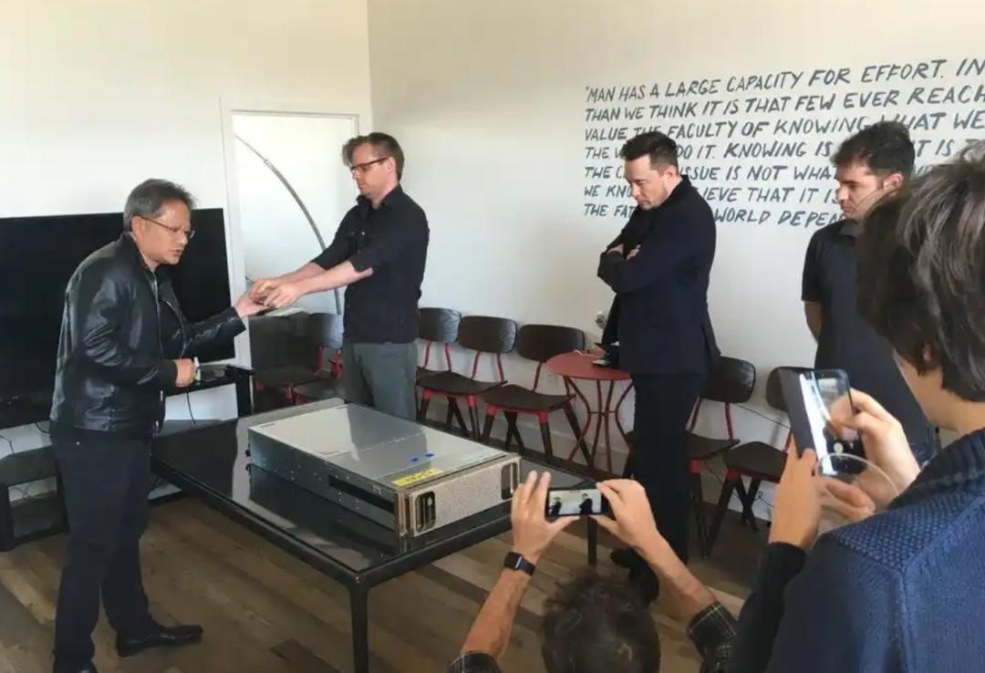 比较早期、也是比较著名的一次,就是10年前送给OpenAI的首台DGX-1(当时马斯克还是OpenAI联合创始人)。