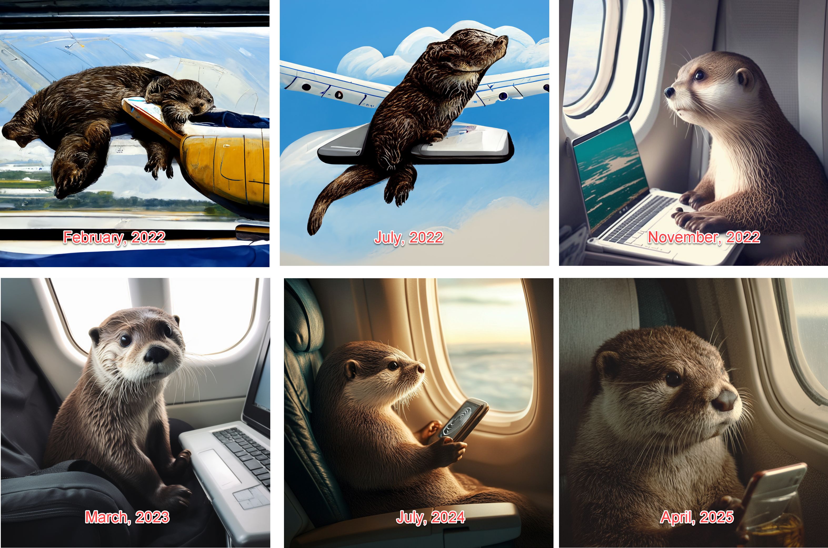 指数级增长你很难直观想象,所以我不打算先用图表,而是想从“水獭”谈起。如果你一直关注我关于 AI 的文章,你一定知道我的“水獭测试”:我挑战过各种 AI 图像模型,让它们生成一张“水獭在飞机上使用 WiFi”的图片。如下所示,从 2022 年(ChatGPT 发布之年)到 2025 年,这个进程是极其迅速且惊人的。