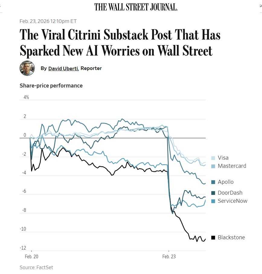 这并非臆测,因为我们刚刚在短短一周内目睹了这一切。2 月 22 日,一家名不见经传的金融公司 Citrini Research 发布了一个虚构情景,描述 AI 的应用可能在 2028 年前摧毁一批老牌企业。文中虽有许多显然牵强的元素,但它触动了华尔街的神经,导致股市价格出现剧烈波动。2 月 26 日,金融服务公司 Block 宣布裁员 40%,并暗示这与 AI 有关。实际上,AI 在其中的作用很可能被大大夸大了,它只是被当作大规模裁员的挡箭牌。最后,为这一周收尾的是 2 月 27 日五角大楼与 AI 公司 Anthropic 之间爆发的一场公开冲突,争论焦点在于:谁有权制定政府使用 Claude 的规则。