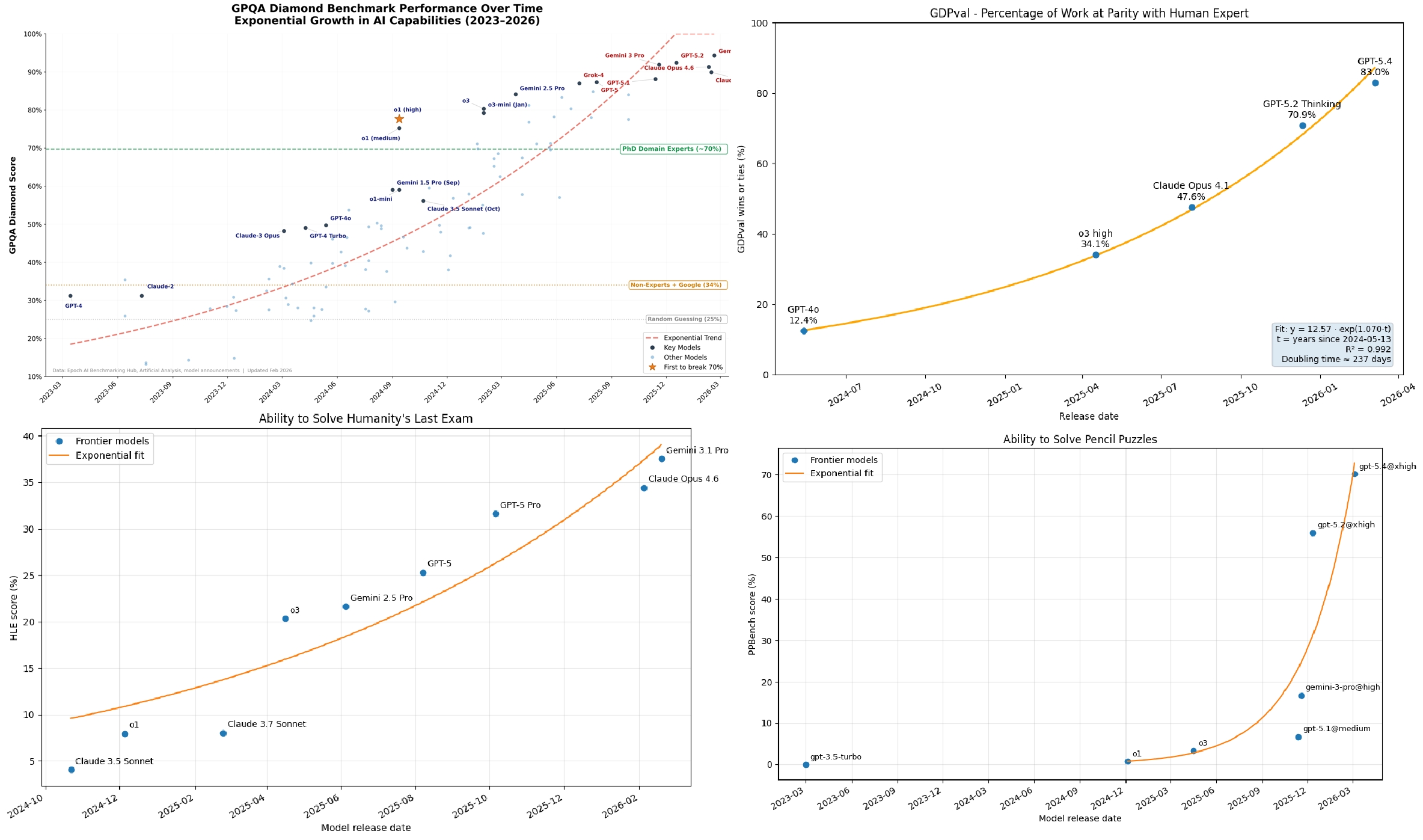 除了一个发音错误外,这段视频几乎完美无缺,甚至水獭都被赋予了拟人化的表情。当然,视频模型很酷,但它们并不一定能代表实用的“智能体 AI”所能达到的高度。那么,如果我们看看 AI 能力的基准测试,是否也能看到同样的指数曲线呢?