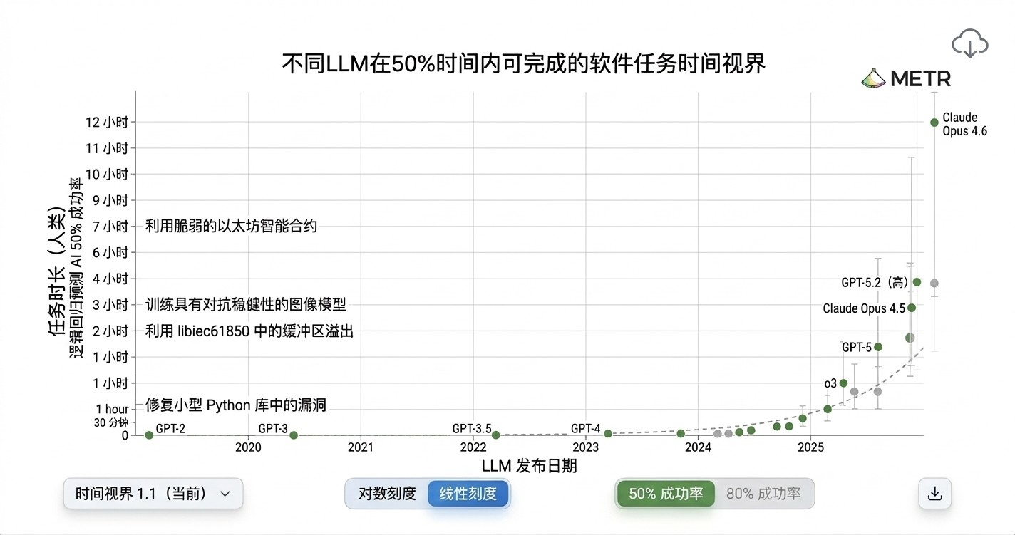 在当今 AI 界最著名的评估体系——METR 长任务图中,我们确实看到了这种趋势。该测试试图通过观察 AI 能在多大可靠程度上自主完成多少人类工作量,来衡量 AI 的进步。虽然它引发了一些批评,甚至 METR 官方也指出了潜在的问题,但就算你不喜欢 METR 图表,你会发现绝大多数衡量 AI 能力的图表都呈现出相同的曲线。