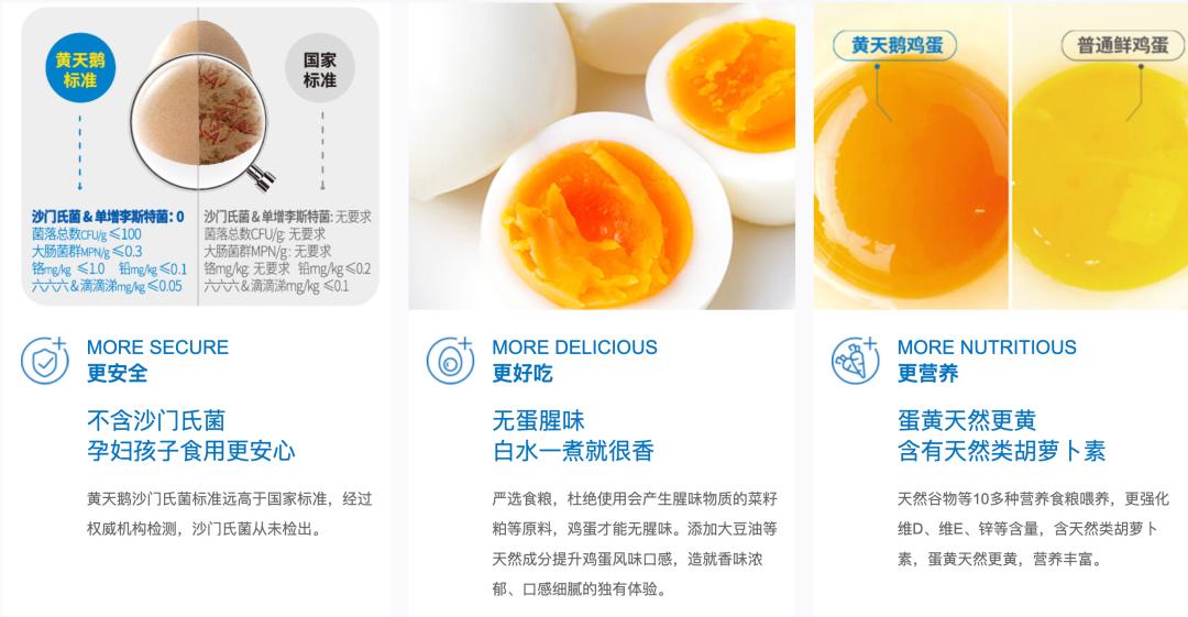 作为2019年成立的品牌,黄天鹅主打“可生食鸡蛋”。不含沙门氏菌、蛋品风味好等,是其产品的主要卖点。