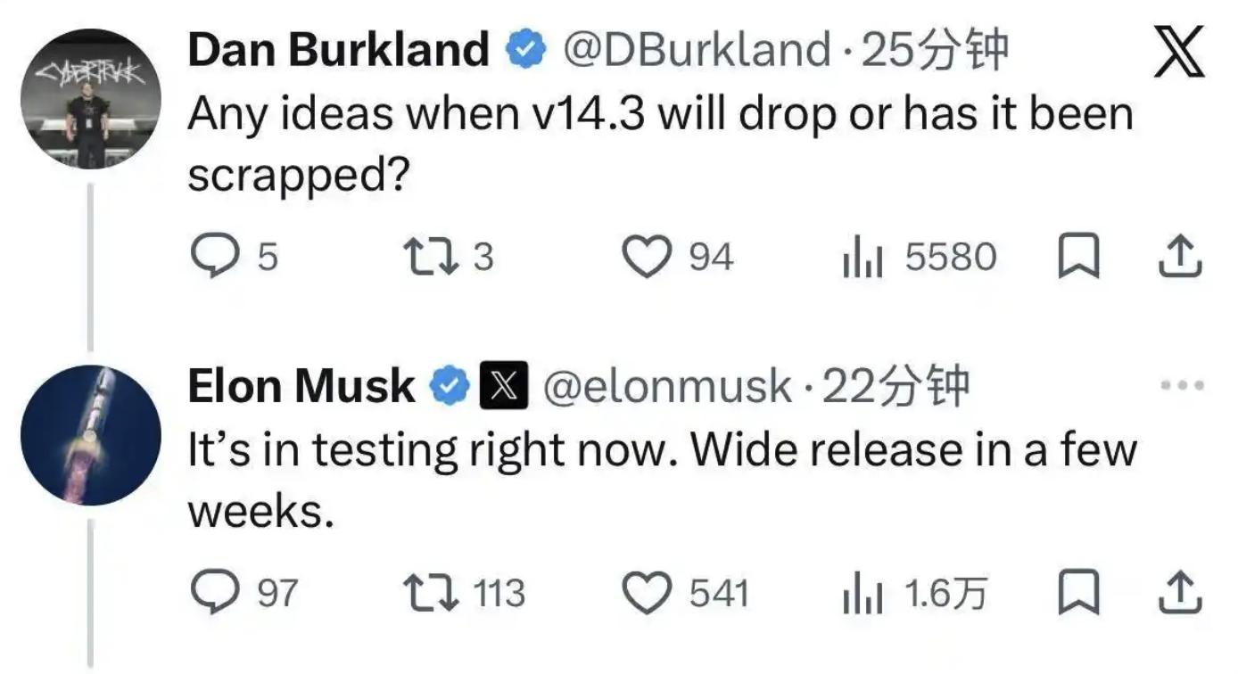 美国时间3月18日,特斯拉CEO马斯克在X平台回复网友提问时确认,FSD V14.3目前已进入内部测试阶段,预计几周后面向用户推送。