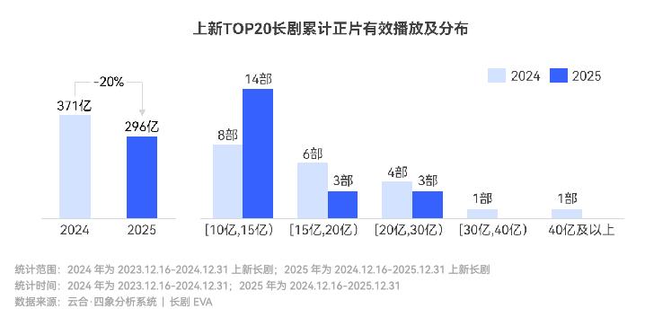 云合数据显示,2025年上新长剧霸屏榜TOP20的正片有效播放同比缩减20%,全年未出现真正意义上的集均破亿超级爆款。微短剧的冲击、用户注意力的碎片化,使得长视频的“爆款逻辑”面临更大压力。