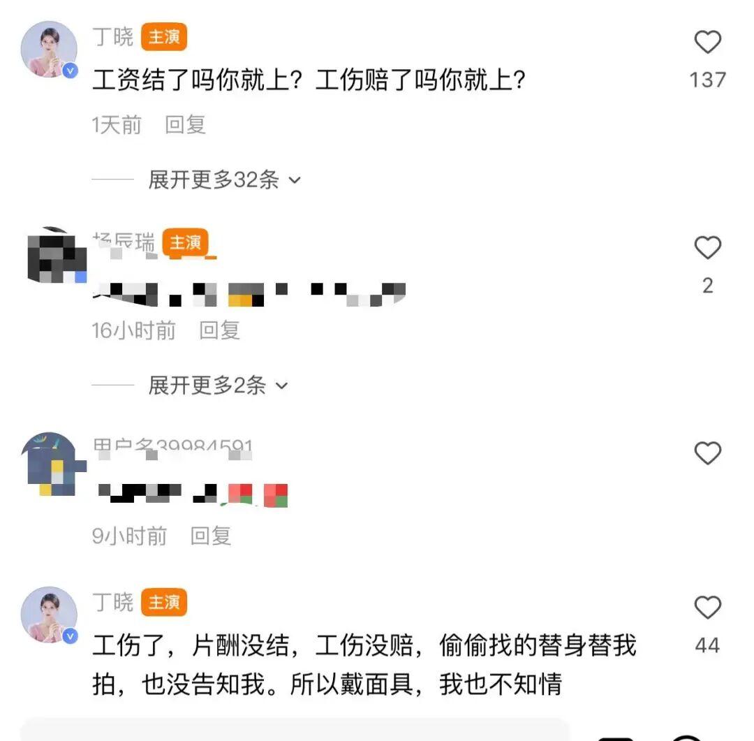 近期,在短剧《女帝驾到》评论区,女主饰演者丁晓留言:“工资结了吗你就上?工伤赔了吗你就上?”“工伤了,片酬没结,工伤没赔,偷偷找的替身替我拍,也没告知我。所以戴面具,我也不知情。”该评论引发了大量关注,很快,她在留言区回复:“片酬已结,后续赔偿在沟通当中。”