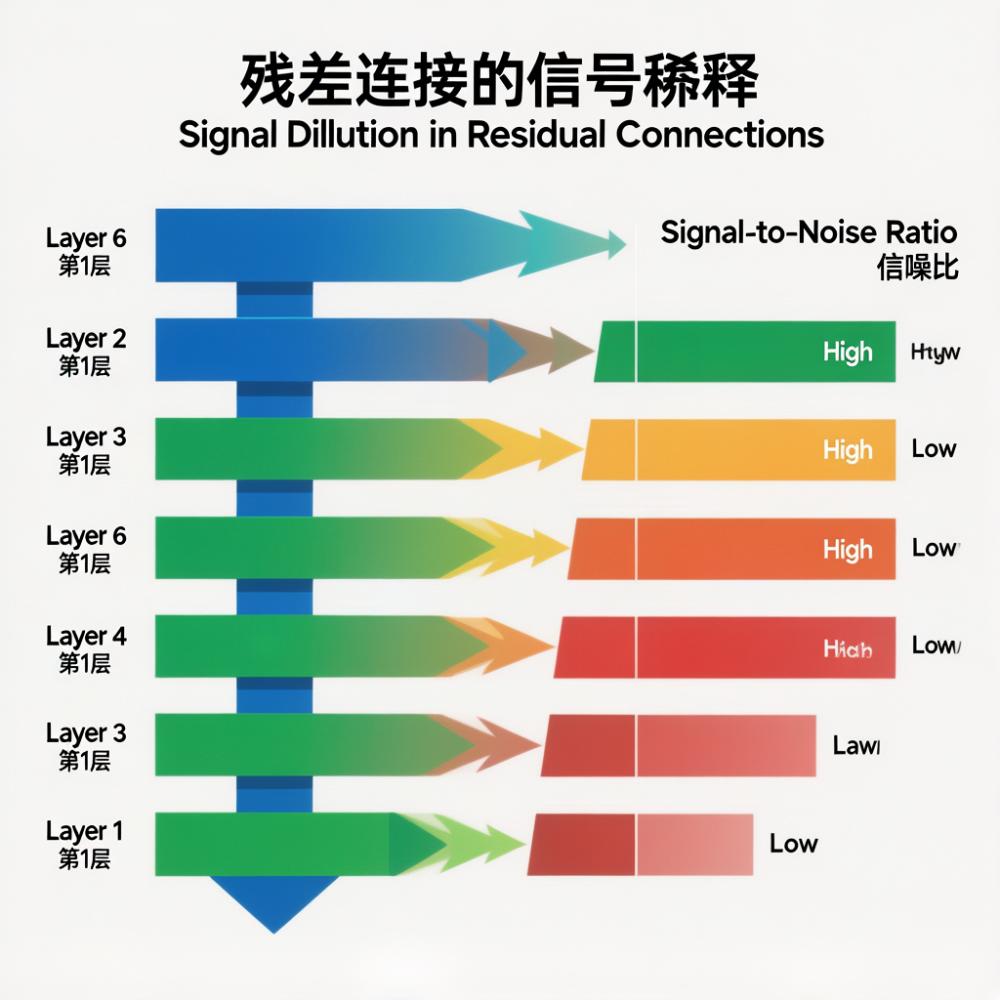 图 1|残差连接的信号稀释效应——层数越深,新信号越难被听见 该图片属于AI生成