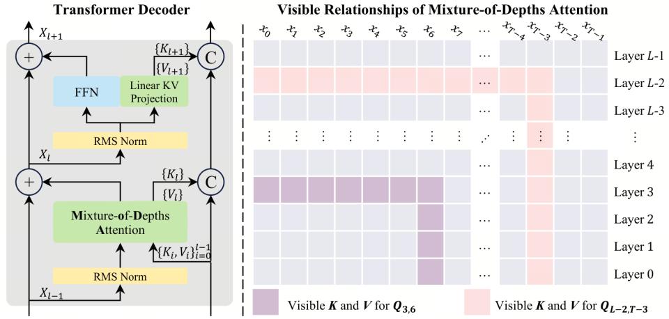 图 3|MoDA 的双维注意力机制——序列维度与深度维度在同一个 Softmax 下联合归一化