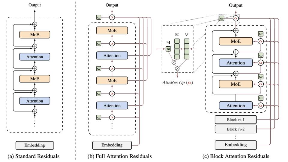 MoDA 没动残差连接,它选择在残差之外另开一条路。同一天,Kimi 团队发的 Attention Residuals(AttnRes)走了一条更直接的路线,直接对残差连接本身动手。