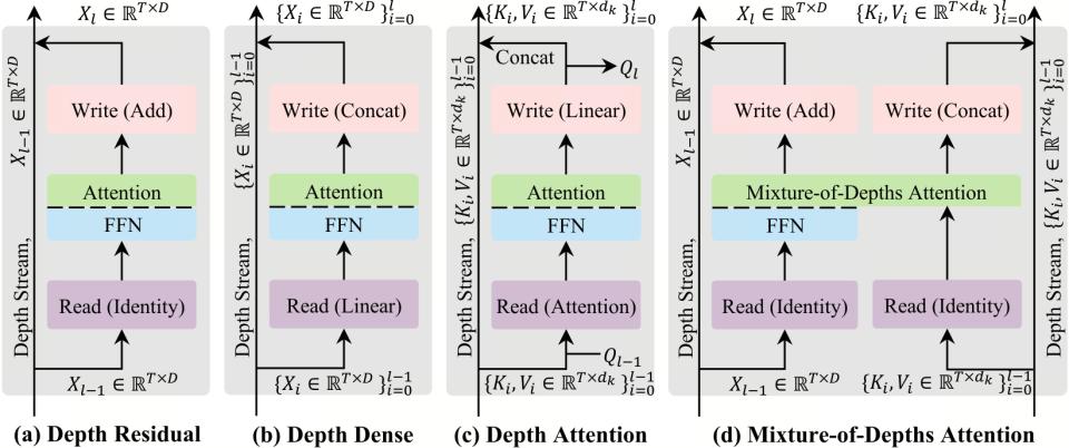 MoDA 的做法是给注意力加上第二个维度——深度维度。每个注意力头在做正常的序列注意力(token 看 token)的同时,也做一个深度注意力(直接去前面所有层取原汁原味的 KV 对)。两路信息在同一个 Softmax 下联合归一化,模型自己决定是该多看看当前层的上下文,还是该回头翻翻浅层学到的特征。残差连接还在,没有被替换,但深层不再只能依赖它来获取浅层信息了。