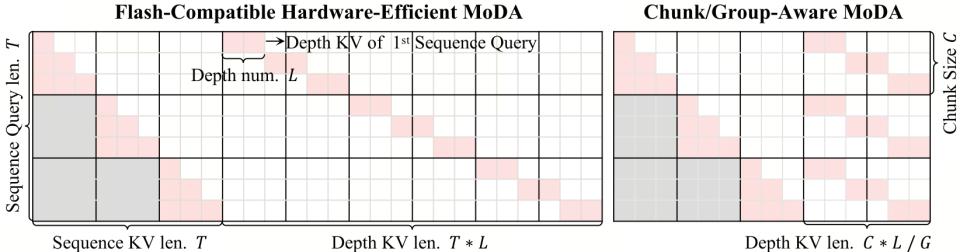 这个设计的关键在于分组的粒度。组太大,每组需要搬运的深度 KV 太多,搬运本身变成瓶颈。组太小,GPU 的并行计算能力用不满。MoDA 选择了和 FlashAttention(目前业界标配的高速注意力计算引擎)相同的分块大小,这样深度注意力的计算可以直接复用 FlashAttention 的底层实现,不需要写一套全新的 GPU 算子。