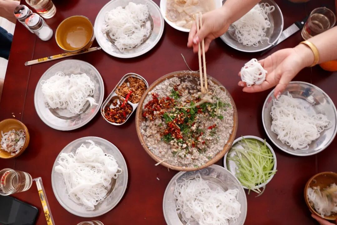 盈江傣族的特色主食,毫甩饵丝。以软米制成的饵丝,滑嫩爽口,搭配特制的酸辣蘸水,再加入薄荷、香菜、花生碎等配料,清爽开胃。不同于昆明的过桥米线,毫甩饵丝更强调酸辣与清爽的平衡,是盈江人日常三餐的常客。
