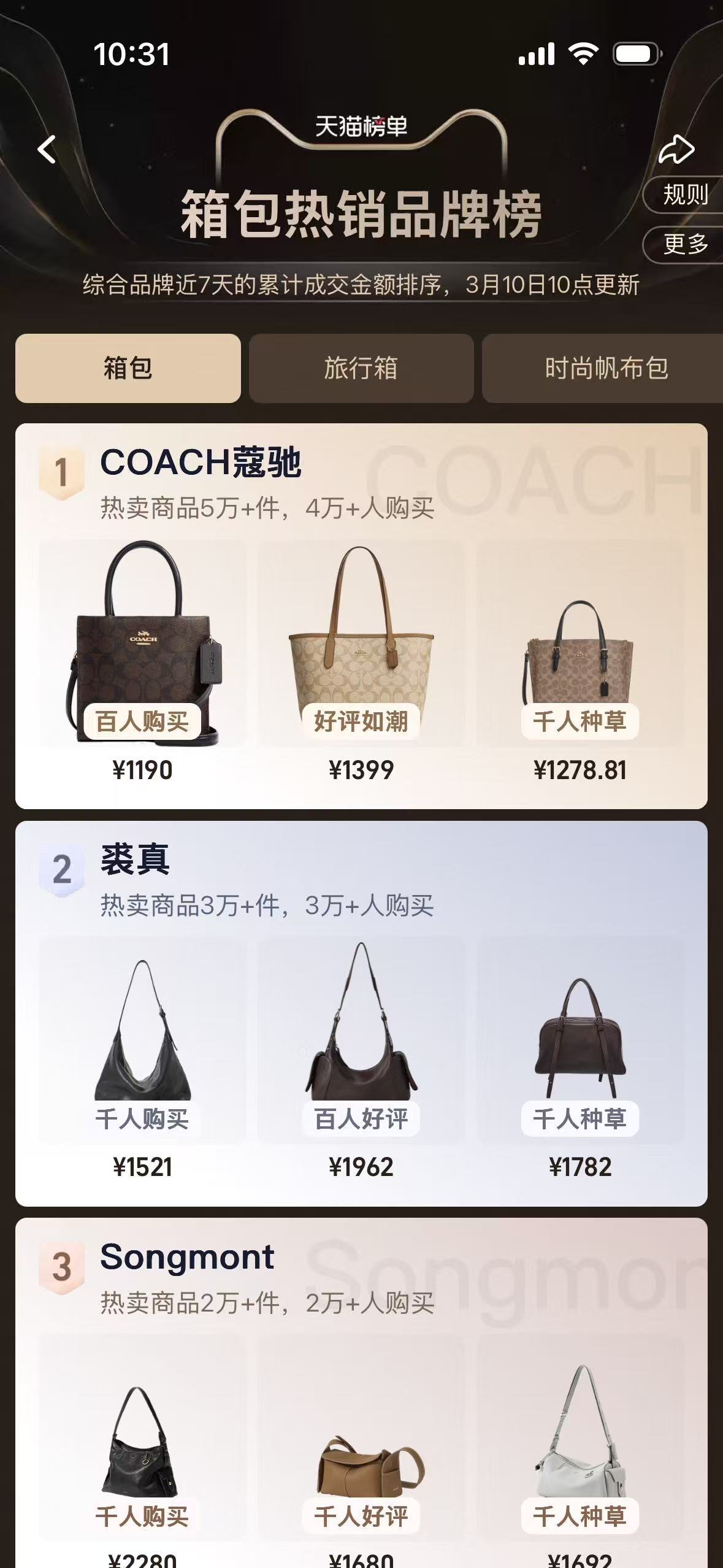 国内女包品牌裘真的发展路径,也是这种长期主义商业逻辑的典型样本。天猫数据显示,裘真在2000元以上的高客单价箱包品牌中,表现出极强的增长性,不仅多次位居行业热销榜前列,在天猫平台上的销量也已开始逼近国际巨头COACH。