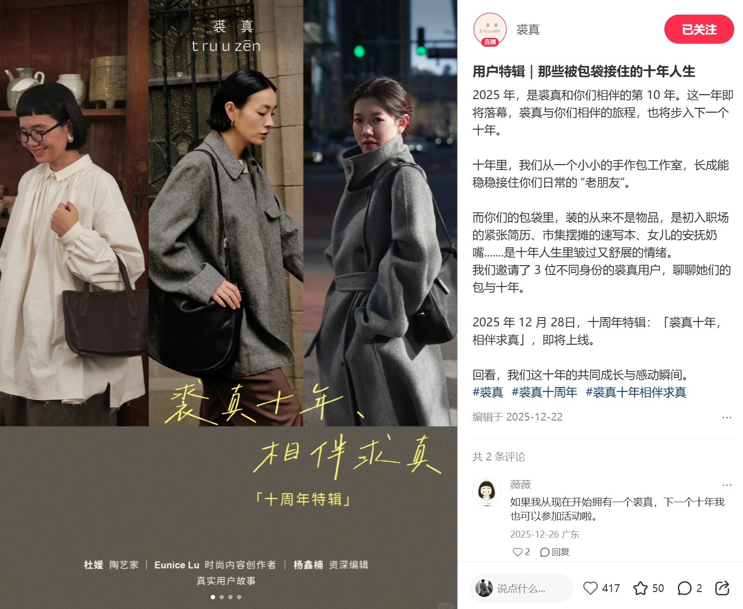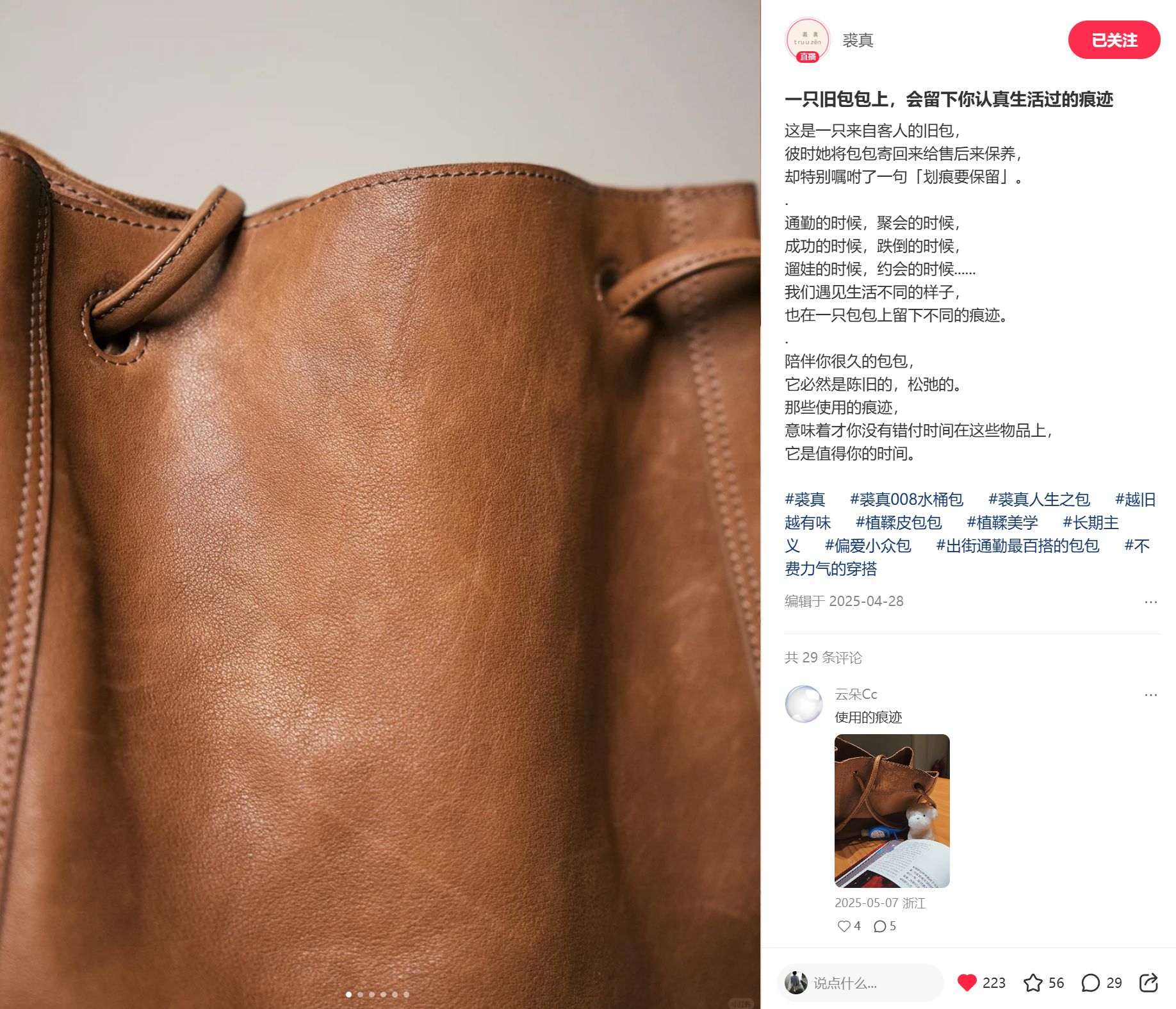 社交媒体上,裘真的消费者也在自发地讲述着真实的故事:“一只沾染油渍的包包经过洗水和擦色后,拥有了独属于自己的全新颜色”;“陪伴主人五年的包包,吸收了浅层的水渍、汗液,染上了与众不同的时光印记”。这种“包浆美学”不是品牌灌输的概念,而是用户在使用中真实体验到的价值。