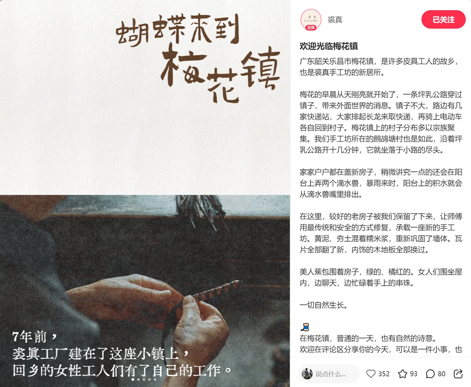 在2025年品牌十周年之际,裘真邀请导演滕丛丛,去到广东韶关乐昌市的梅花镇,拍摄了一支名为《蝴蝶来到梅花镇》的纪录短片,记录下裘真女工们普通的一天。