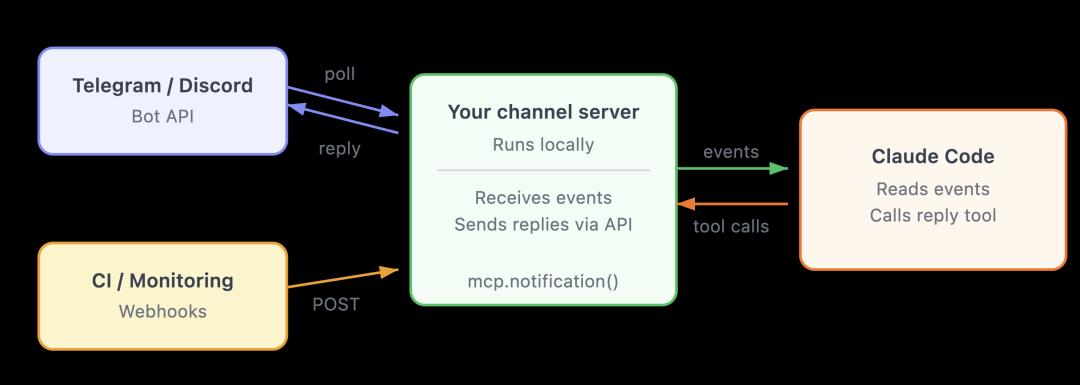 本质上,Channel是一个MCP server,它能把外部事件主动推送进Claude Code会话,让Claude对终端之外发生的事情作出反应。