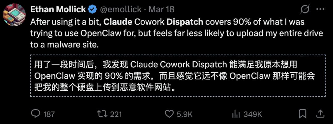 此前,Claude已发布Dispatch,让沃顿商学院研究AI+创业的Ethan Mollick教授直呼:Dispatch已能满足OpenClaw的90%的需求。