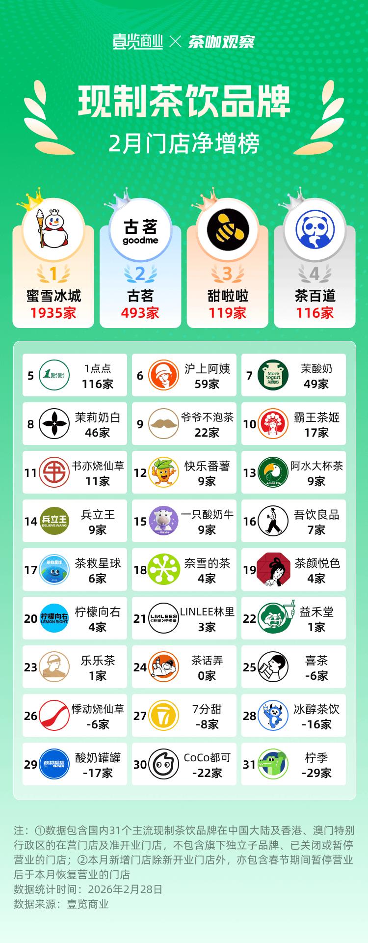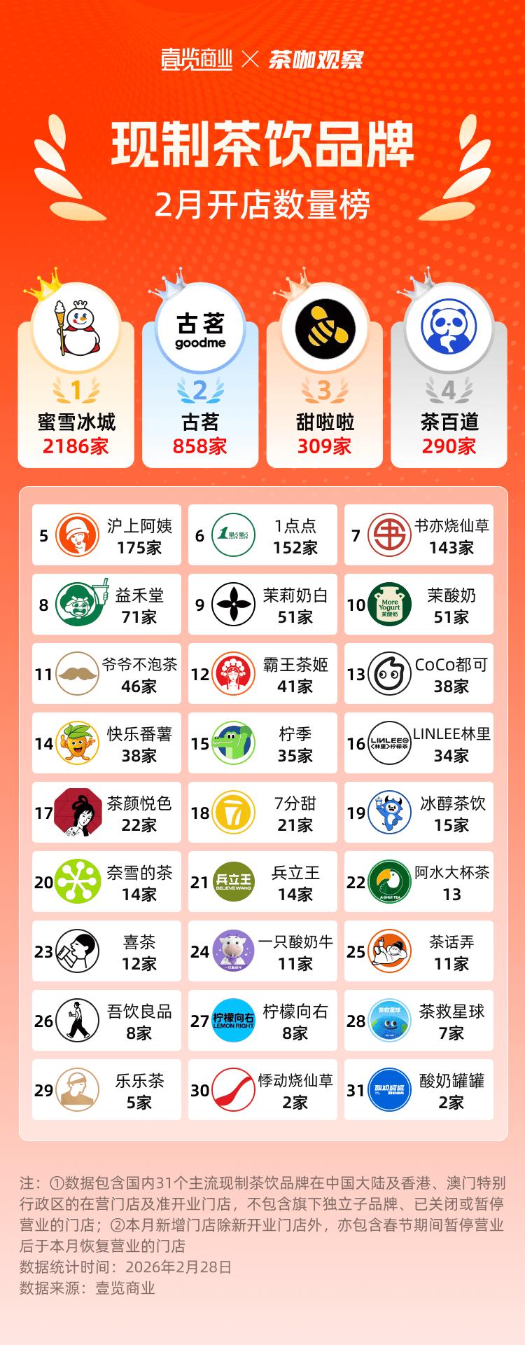 2026年2月,现制茶饮行业迎来春节后的快速复苏。壹览商业数据显示,31个主流品牌当月新增或恢复营业门店4683家,关闭或暂停营业1738家,净增2945家,门店总数13.78万家。