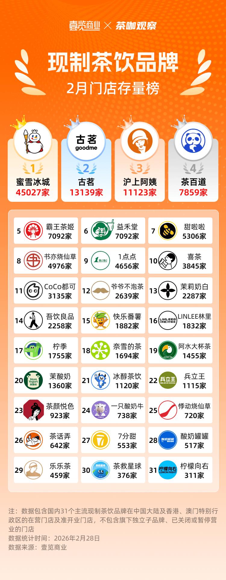 在我们最新发布的《中国现制茶饮行业月度报告(2026 年 2 月)》完整版中,我们还深度拆解了 31 个品牌的区域拓展全景: