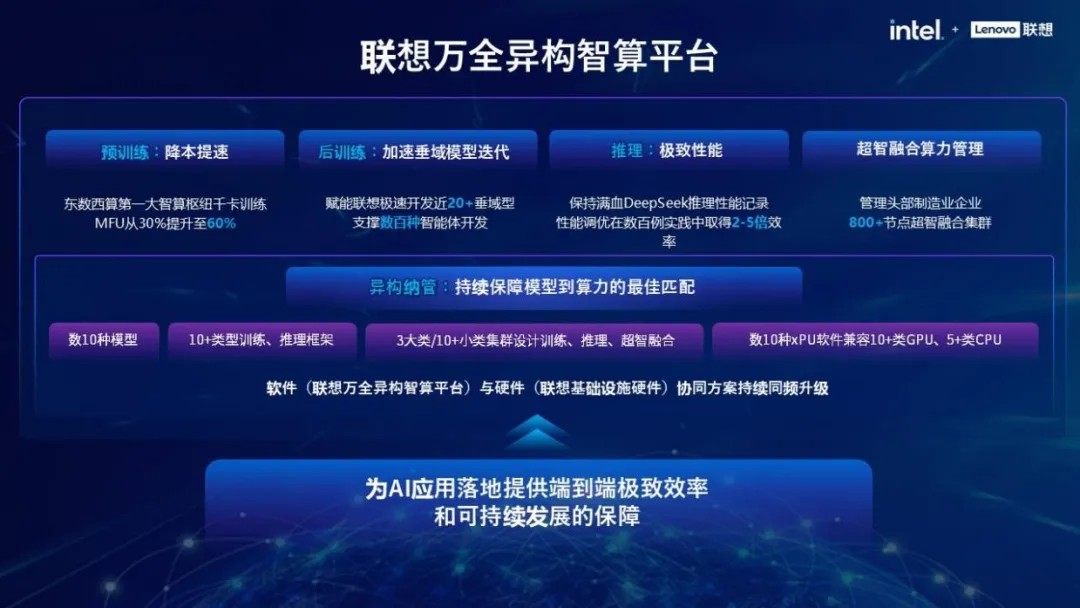 随着AI应用重点从模型训练全面迈向推理应用,智能体交互、实时决策等场景,这对算力效率、响应速度与能耗控制提出了全新挑战。联想敏锐洞察这一趋势,围绕“更强大、更稳定、更高效、更绿色”的设计理念,在后训练时代持续演进和强化基于英特尔®至强®6的通用算力基础设施底座,同时在智慧算力领域,采用“1+3+N”服务器架构:以统一系统架构为基石,灵活兼容三大主流CPU平台,并广泛支持多家国产及国际GPU芯片。这一开放架构不仅能为训练场景提供澎湃算力,更可以通过多样化的算力组合与精细化功耗管理,精准匹配推理负载对高吞吐、低延迟的极致要求,为企业提供从训练到推理的无缝升级路径,助力构建高效、安全、自主可控的“AI工厂”。