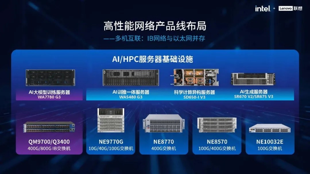 AIGC业务的爆发对网络提出了高带宽、低时延、高密度的严苛要求。联想通过高性能网络产品线布局,实现IB网络与RoCE以太网并举。其中,联想问天 NE8770-64QC 400G交换机凭借其高密度端口与RDMA端到端无损网络技术,成为智算中心的骨干互联设备。