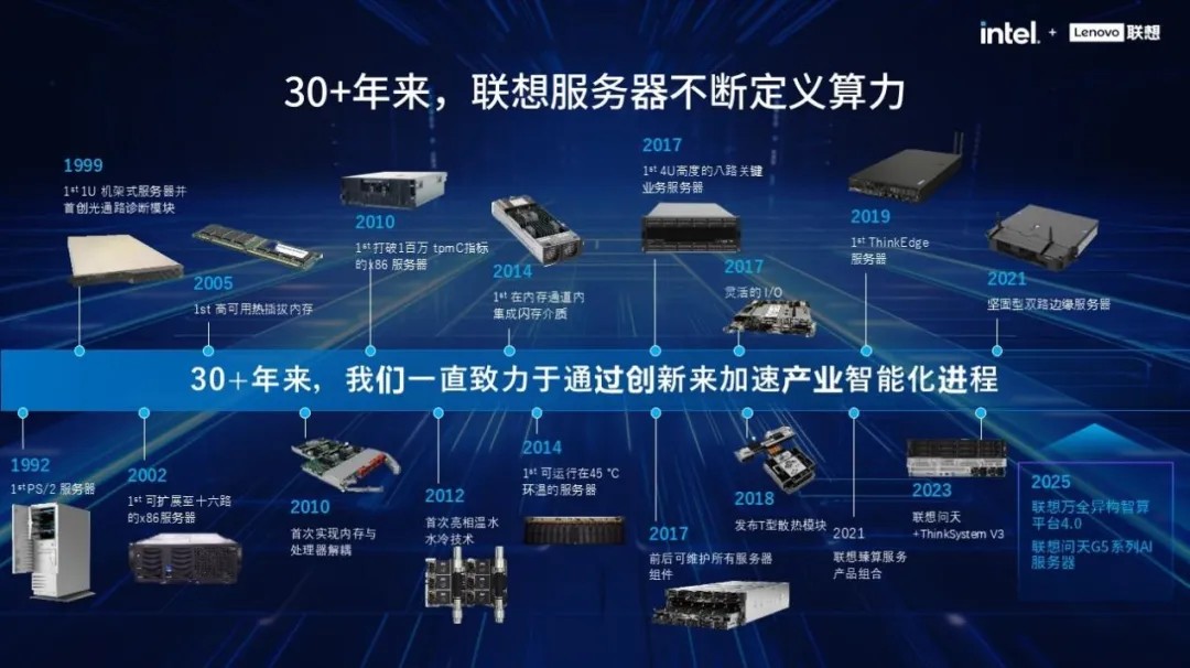 从2012年率先探索液冷技术,到如今以“一横四纵”战略全景式布局AI算力基础设施,联想正依托英特尔®至强®6处理器等合作伙伴的前沿技术,持续推动AI从概念走向落地,从云端走向本地。