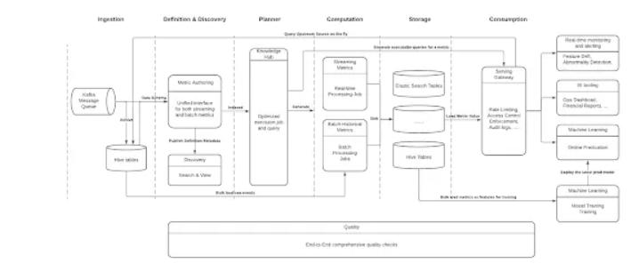 [事件流] → [数据管道] → [指标定义] → [指标计算引擎] → [质量验证] → [指标 API] → [仪表盘/机器学习/应用]