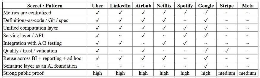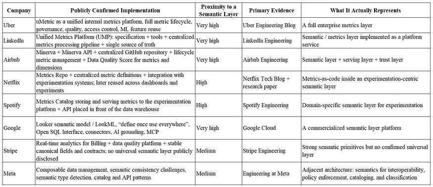 商业智能供应商将其作为一种便捷的指标模型进行销售。现代数据架构称之为指标层。人工智能团队则声称,如果没有它,就无法构建分析代理。但如果你仔细观察一下主要科技公司(Uber、Netflix、Airbnb、LinkedIn、Spotify)的架构,就会发现它们的含义与“语义层”一词通常所暗示的含义截然不同。