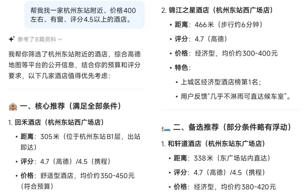 他只会打开AI,说一句:“帮我找一家杭州东站附近、价格400左右、有窗、评分4.5以上的酒店。”