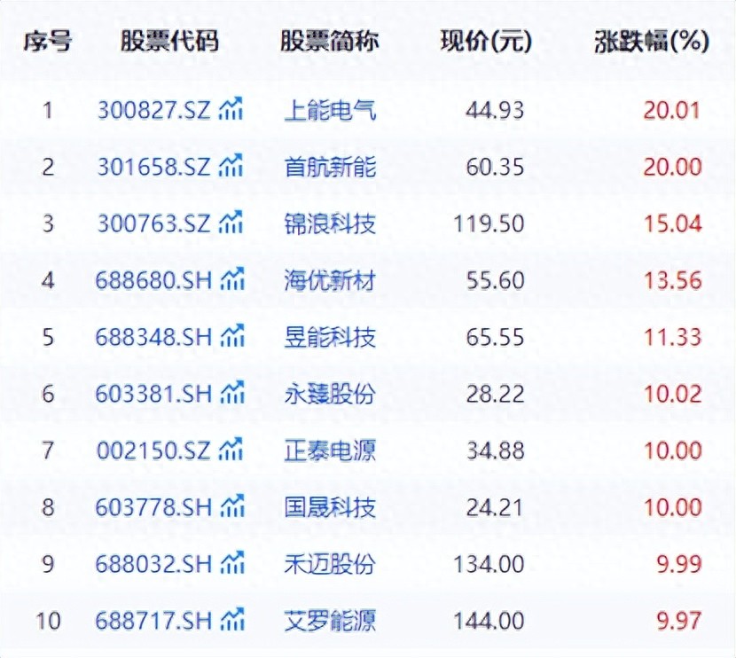 截至收盘,上能电气(300827.SZ)、首航新能(301658.SZ)、永臻股份(603381.SH)、禾迈股份(688032.SH)、艾罗能源(688717.SH)等多股涨停,锦浪科技(300763.SZ)、海优新材(688680.SH)、昱能科技(688348.SH)等涨超10%。