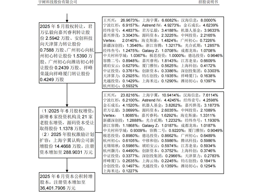 2025 年 5-6 月,宇树科技完成上市前的股权转让、增资扩股及股权激励,注册资本增至 36401.7906 万元,实控人王兴兴直接持股 23.82%,仍为公司第一大股东。|图片来源:宇树科技招股书