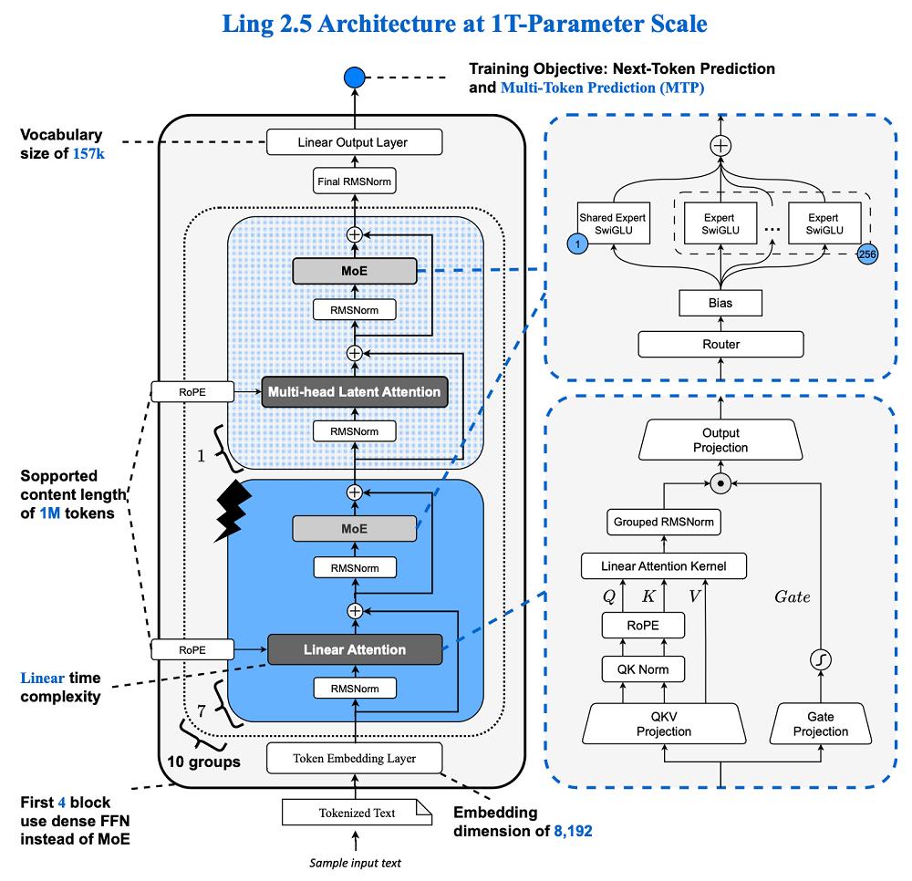 同样在去年9月,蚂蚁百灵团队开源了Ring-mini-linear-2.0与Ring-flash-linear-2.0,验证了其研发的Lightning Linear线性注意力在工业规模训练和长上下文推理中的可用性。