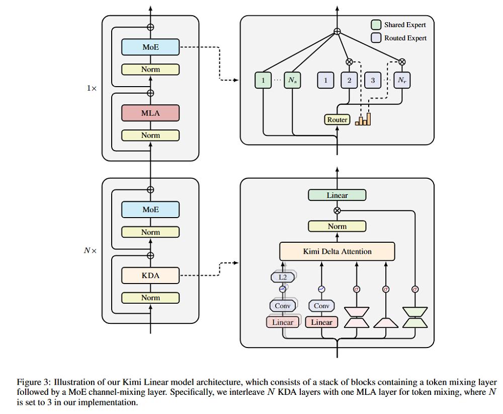 去年10月,月之暗面开源了混合线性注意力架构Kimi Linear。其核心是Kimi Delta Attention(KDA),这是一个新型的线性注意力模块,通过细粒度设计改进了门控delta规则。这一线性架构采用1:3的混合比例,在减少内存占用的同时超越了全注意力模型的质量。