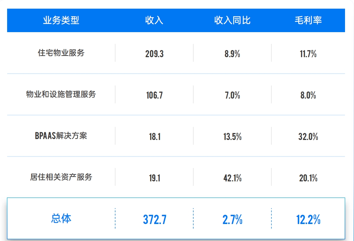 万物云的收入主要来自四部分:住宅业务、非住宅业务、BPAAS解决方案和居住相关资产服务。其中,面向居住市场的住宅物业和面向企业、公共机构的非住宅物业是万物云的基本盘。