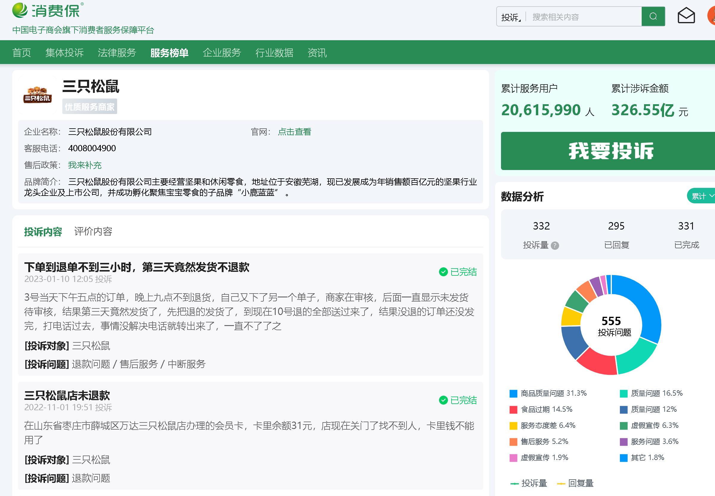 此外,据黑猫投诉、消费保平台数据显示,截至2026年3月中旬,三只松鼠累计投诉量超2700条,近半年新增投诉中,异物、发霉、虫卵、变质、异味等食品安全问题占比超70%。