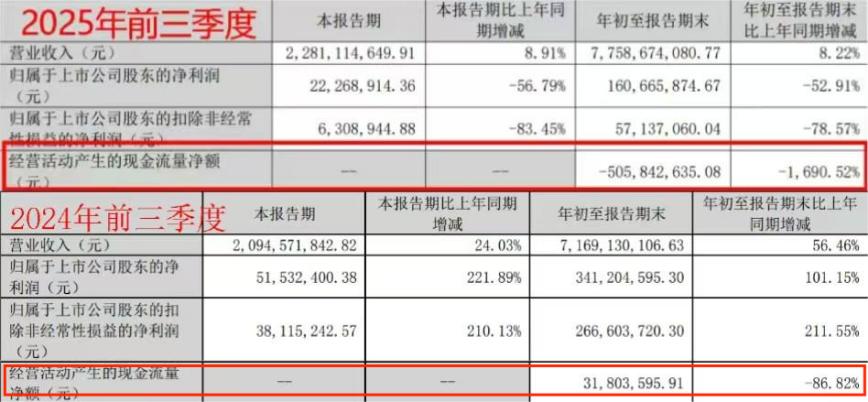 相较于利润下滑,更为严峻的是三只松鼠面临的现金流危机。截至 2025 年三季度末,公司经营活动产生的现金流量净额为 - 5.06 亿元,同比大幅下降 1690.52%,实现了从 2024 年同期 3180 万元净流入到如今巨额净流出的逆转。