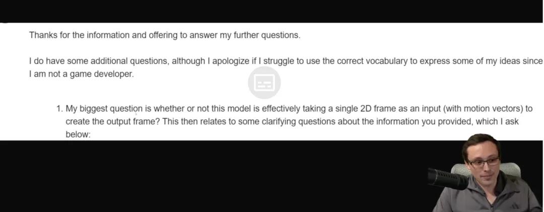 可以看到,这位英伟达布道师并没有直接回答 Owen 的提问。但是他所说的「完全通过分析单帧来完成」已经揭开了真相:DLSS 5 并没有跟游戏引擎合作,甚至不需要游戏引擎,它的唯一输入,就是当前帧。