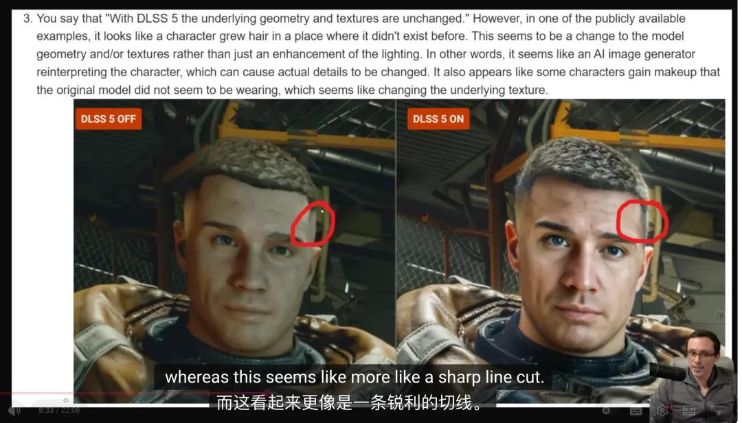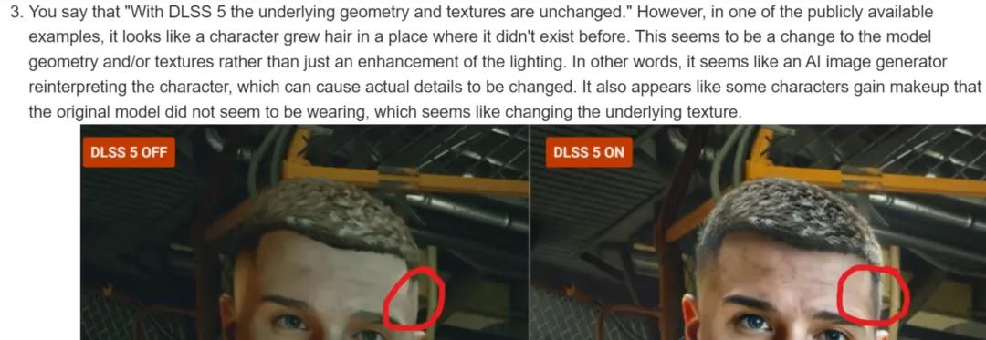 你甚至可以看到,DLSS 5 生成后的发型,两侧长度出现了不对称的情况。