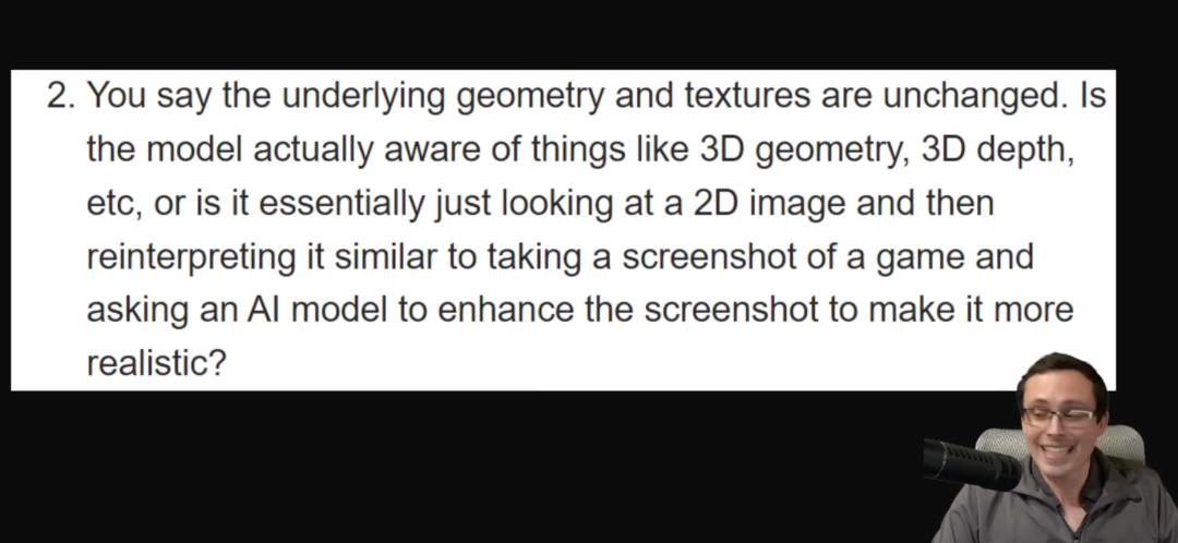 第二轮追问:英伟达此前说的「底层几何和材质不变」,那么 DLSS 5 模型是否真的理解 3D 几何、深度等细节,或者只是分析 2D 帧?
