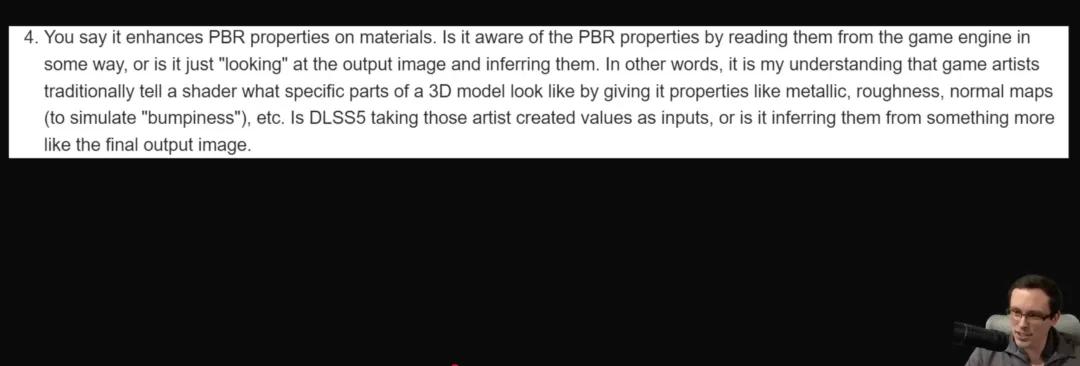 第四轮追问:英伟达说 DLSS 5「增强材质 PBR 属性」,它是真的读取了美术师在游戏引擎里设置的金属度、粗糙度、法线贴图,还是只是从 2D 图像里猜?