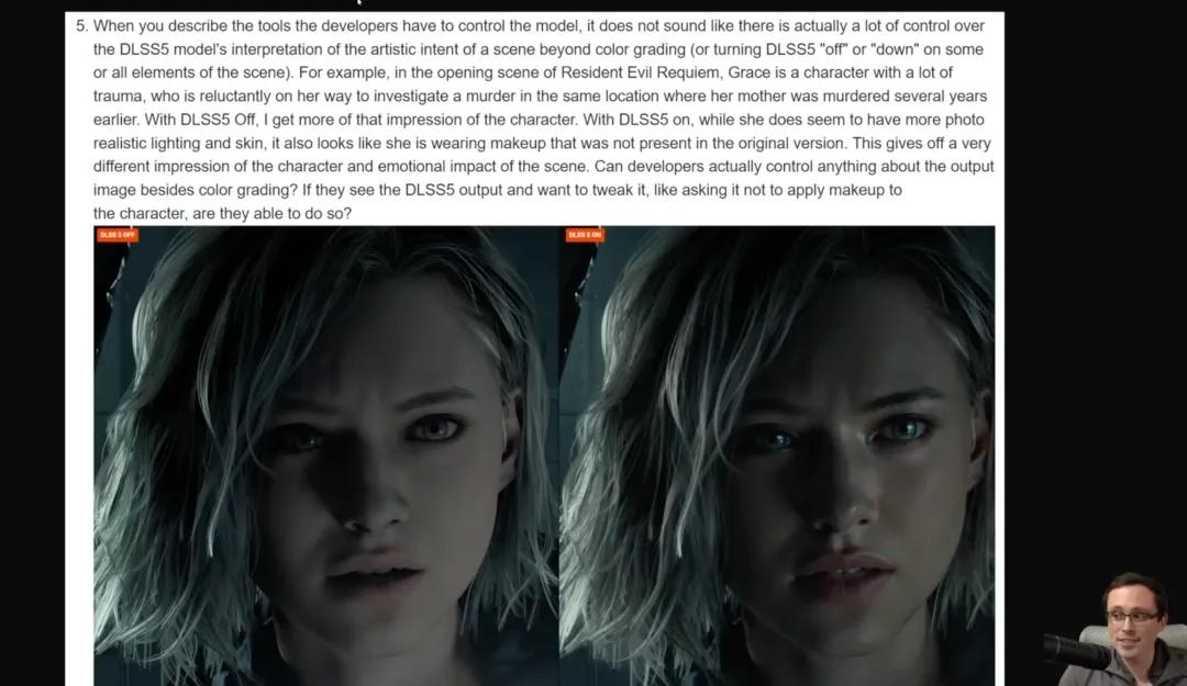 第五轮追问:以《生化危机》的格蕾丝为例,她是一个带着创伤赶赴命案现场的角色,DLSS 5 让她看起来像是化了妆准备去约会。开发者能不能告诉 DLSS 5「不要给她加妆」?开发者到底拥有多大的控制权限?