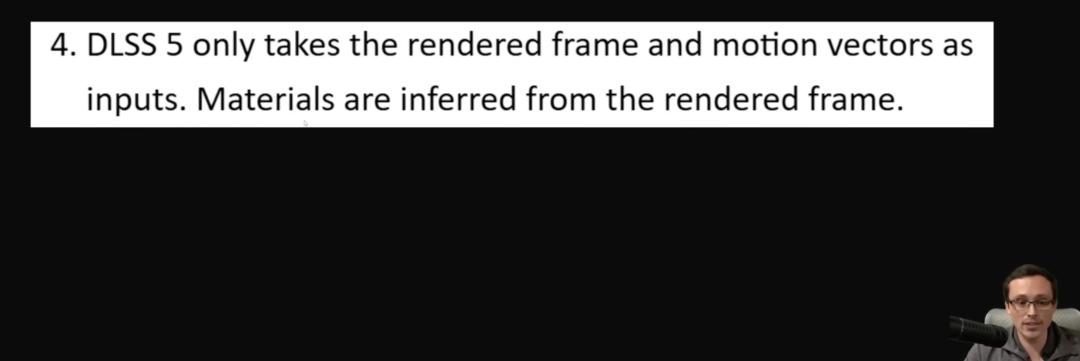 回答:DLSS 5 只接受渲染帧和运动矢量作为输入。材质属性是从渲染帧中推断出来的(inferred from the rendered frame)。