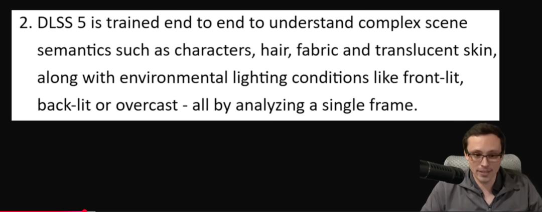 回答:DLSS 5 通过端到端训练,实现对复杂场景语义的完整理解——完全通过分析单帧来完成