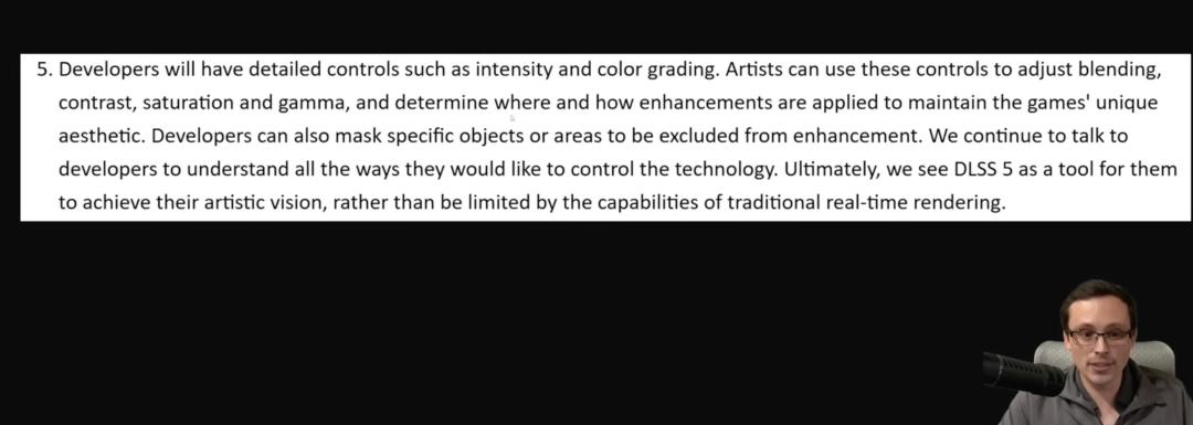 回答:开发者有强度调节(原帧与 AI 输出之间的混合比例)、颜色分级(对比度/饱和度/伽马)、遮罩功能。英伟达会持续与开发者沟通,了解他们希望如何控制这项技术。」